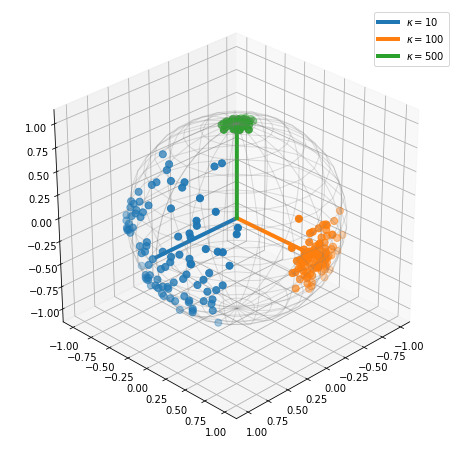 \[\begin{aligned} p_{X}(x; \mu, \kappa) = N_{X}(\kappa, d)^{-1}(1 + \mu^{\top}x)^{\kappa} \end{aligned}\]
